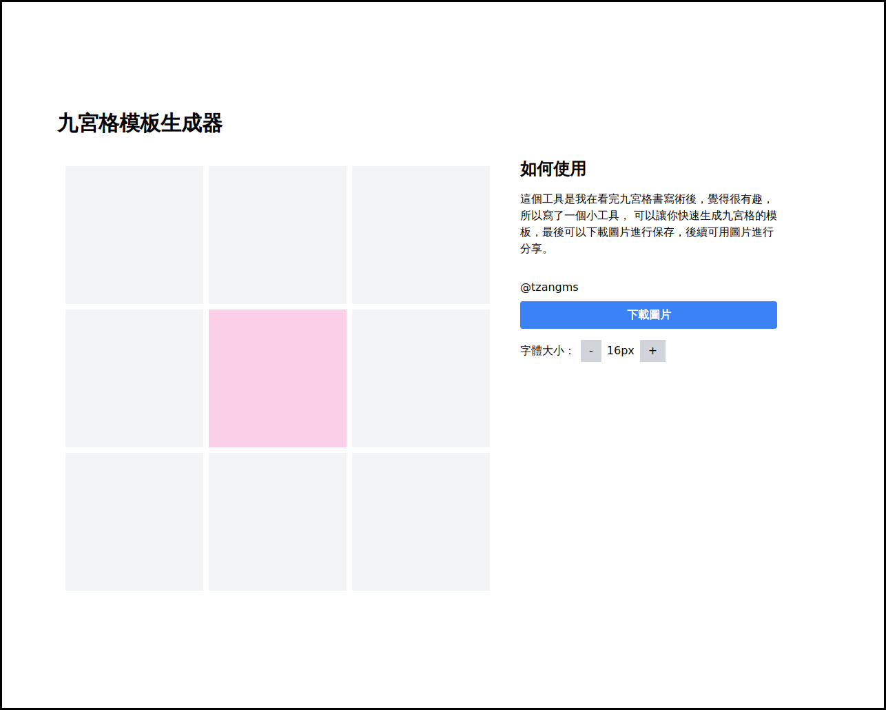 上禮拜看完了九宮格寫作術之後,寫讀書心得寫到一半覺得少了什麼,我就開發了這個工具,可以讓我快速填寫九宮格後直接下載圖檔。
