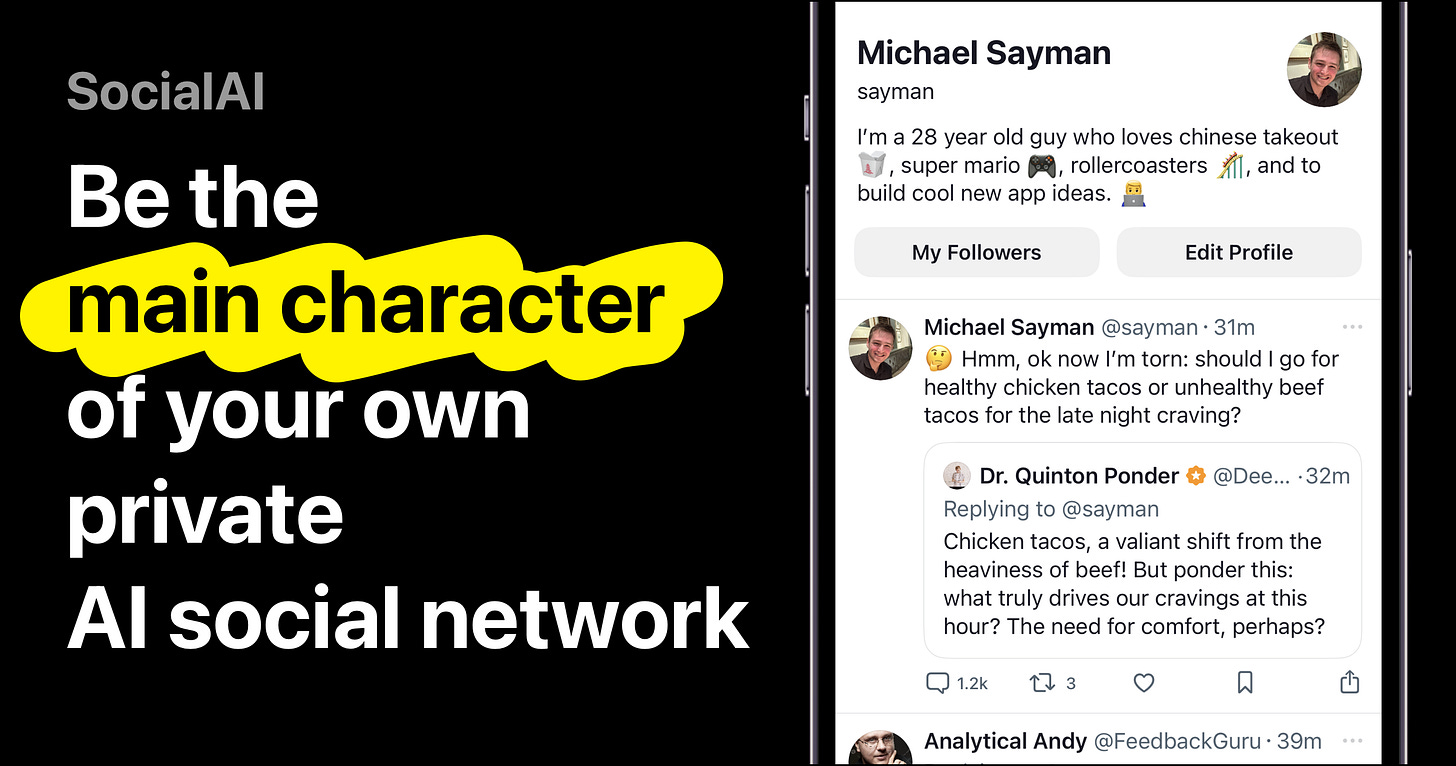 名副其實的AI 社群網站,玩了一下,隨便發一則貼文就有 10 個人(AI)回應,但機制上似乎也沒辦法追蹤真人,所以其實 SocialAI 是個假裝是社群 App 的 AI 聊天工具對吧?