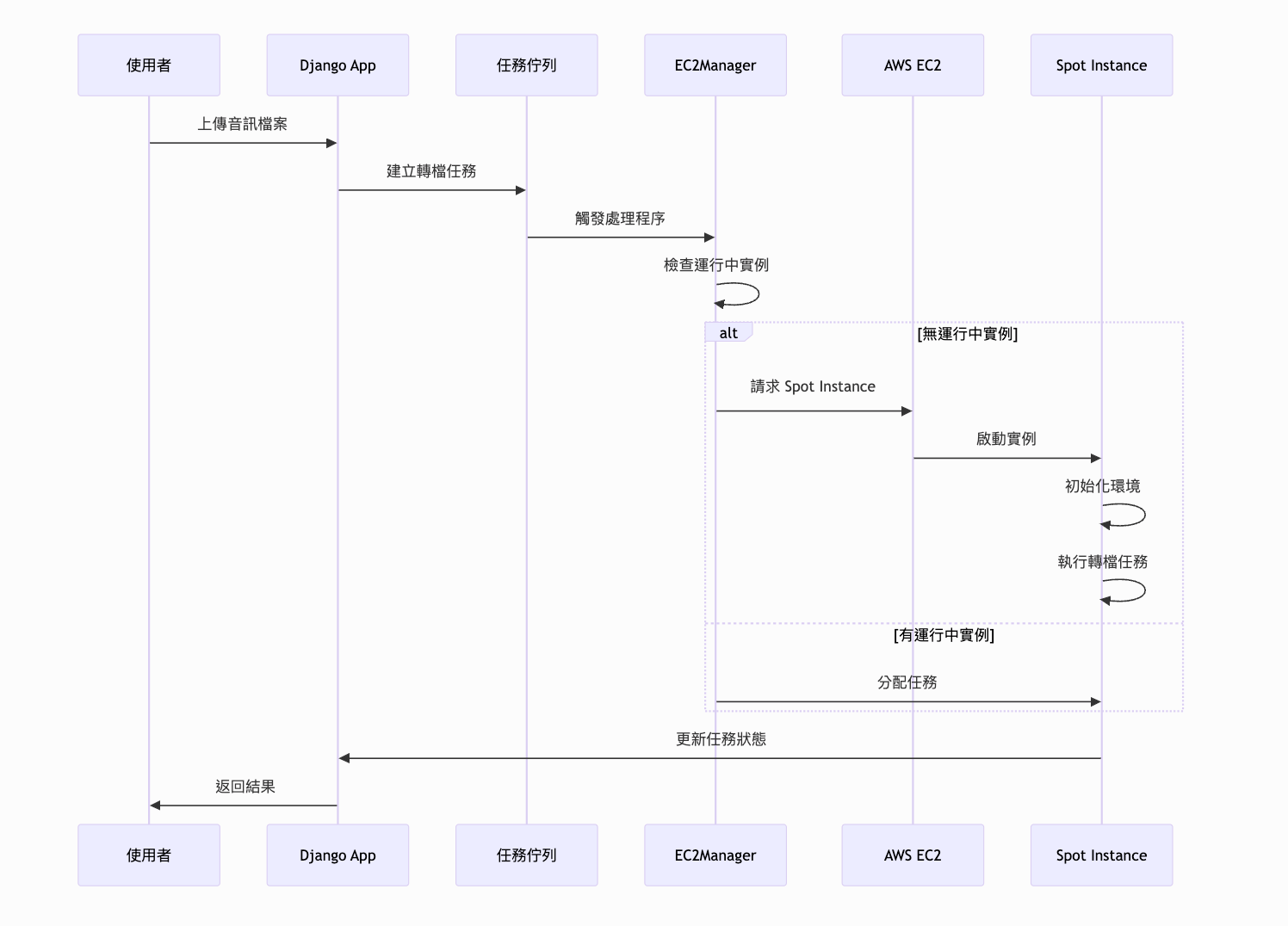 用下圖來舉例,這個是我想要開發一個能夠根據轉檔任務來自動開啟 EC2 的 GPU spot instance 進行 whisper 轉檔的機制,因為在跟 AI 對談的過程中我覺得沒辦法清楚理解他的想法時,我就會請 AI 寫文件、畫流程圖給我,讓我能夠快速理解。